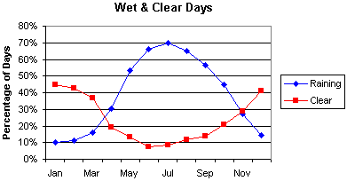 This shows how often it rains in winter - most days. Summer is the opposite with mainly cloudless sunny days and only occasional rain. |
