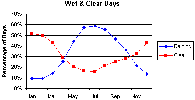 This shows how often it rains in winter - most days. Summer is the opposite with mainly cloudless sunny days and only occasional rain. |