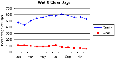 For most of the year rain falls at least every second day. There are more rainy days here than on the Central Plateau so expect some wild wet weather. |