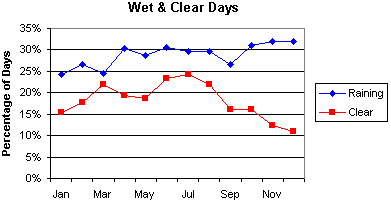 There are almost as many fine days as rainy ones. Rain rarely persists for long so expect lots of fine weather and the occasional damp day. |