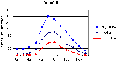 This shows how often it rains in winter - most days. Summer is the opposite with mainly cloudless sunny days and only occasional rain. |