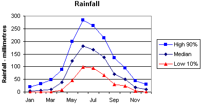 This shows how often it rains in winter - most days. Summer is the opposite with mainly cloudless sunny days and only occasional rain. |
