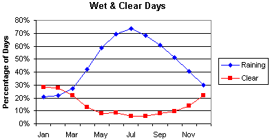 Winter can be miserable as it rains on most days. November to March has the least rain although there are still a significant number of rainy days. |